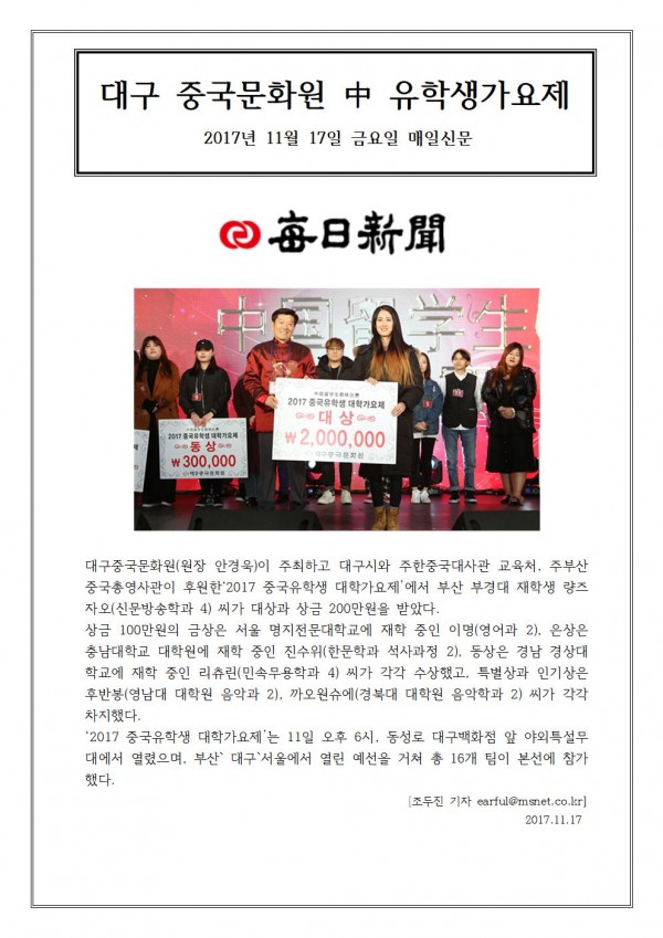 대구 중국문화원 中 유학생가요제 페이지 정보 작성자 중국문화원 작성일17-12-22 17:48 조회2,466회 댓글0건 이전글 다음글 본문 댓글목록 등록된 댓글이 없습니다. 이전글 다음글