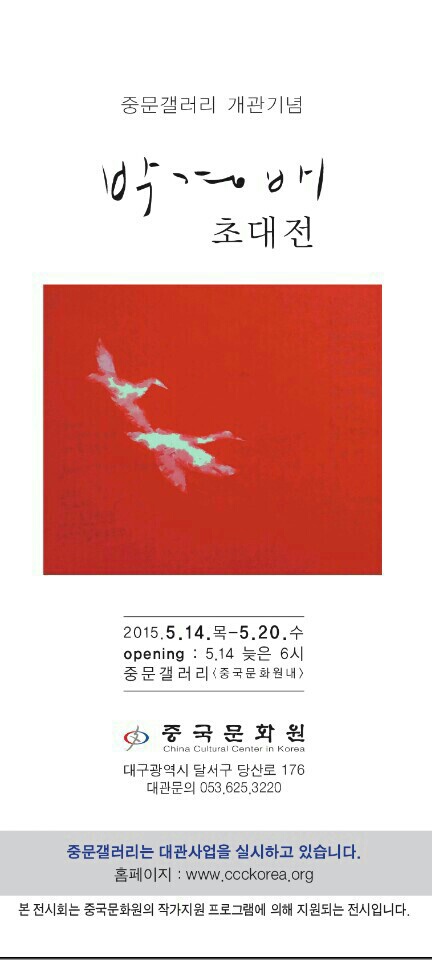 2015.05.14~05.20 중문갤러리 개관기념 박경배 초대전 페이지 정보 작성자 중국문화원 작성일15-11-12 13:45 조회2,518회 이전글 다음글 본문 2015.05.14 - 05.20 중국문화원내 중문갤러리 개관기념으로 박경배 초대전이 진행되었습니다^^ [이 게시물은 중국문화원님에 의해 2015-11-12 13:46:46 행사갤러리에서 이동 됨] [이 게시물은 중국문화원님에 의해 2015-11-12 13:50:28 자유게시판에서 이동 됨] 이전글 다음글